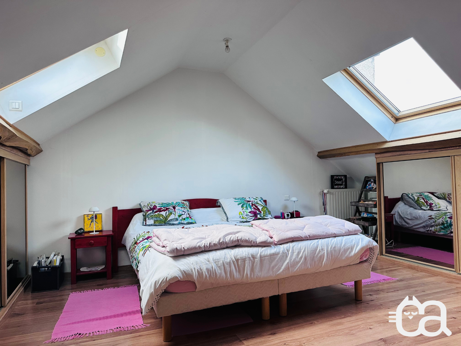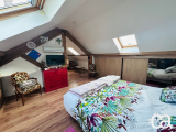 Au second et dernier étage, un vaste espace avec poutres apparentes et velux s’incarne en véritable suite parentale, séparée des autres espaces par une porte palière. Avec ses murs blancs et ses poutres apparentes pleines de cachet, l’espace propose à la fois une grande chambre avec rangements intégrés, parquet et deux velux neufs, ainsi qu’un espace qui peut accueillir un bureau intime avec vue sur ciel. De l'autre côté du palier, une salle d’eau avec velux, douche, toilettes, vasque et rangements renforce l'intimité et l’indépendance de ce dernier étage.