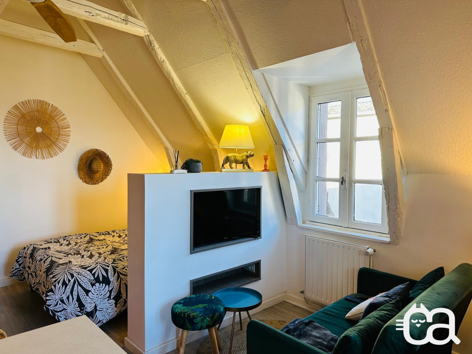 Le nid propose tout le confort et les équipements nécessaires à un séjour agréable. Et cet aspect pratique s’accompagne d’un grand souci esthétique. En effet, Le nid réussit l’exploit d’offrir un cocon douillet, lumineux et calme en même temps qu’une impression d’espace. Habilement, les pièces d’eau, salle d’eau, toilettes et coin cuisine ont été placées au fond du studio. Elles favorisent donc l’impression d’espace de la partie nuit et de la pièce de vie. Astuce d’aménagement, la partie nuit est séparée de la partie pièce de vie par une cloison basse à double usage qui abrite des niches du côté nuit et une télévision encastrée du côté pièce de vie. Celle-ci accueille tout autant un canapé qu’un espace de (télé)travail.